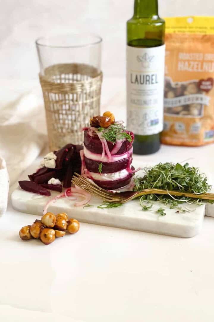 Hazelnut Oil Beet and Goat Cheese Salad with Candied Hazelnuts